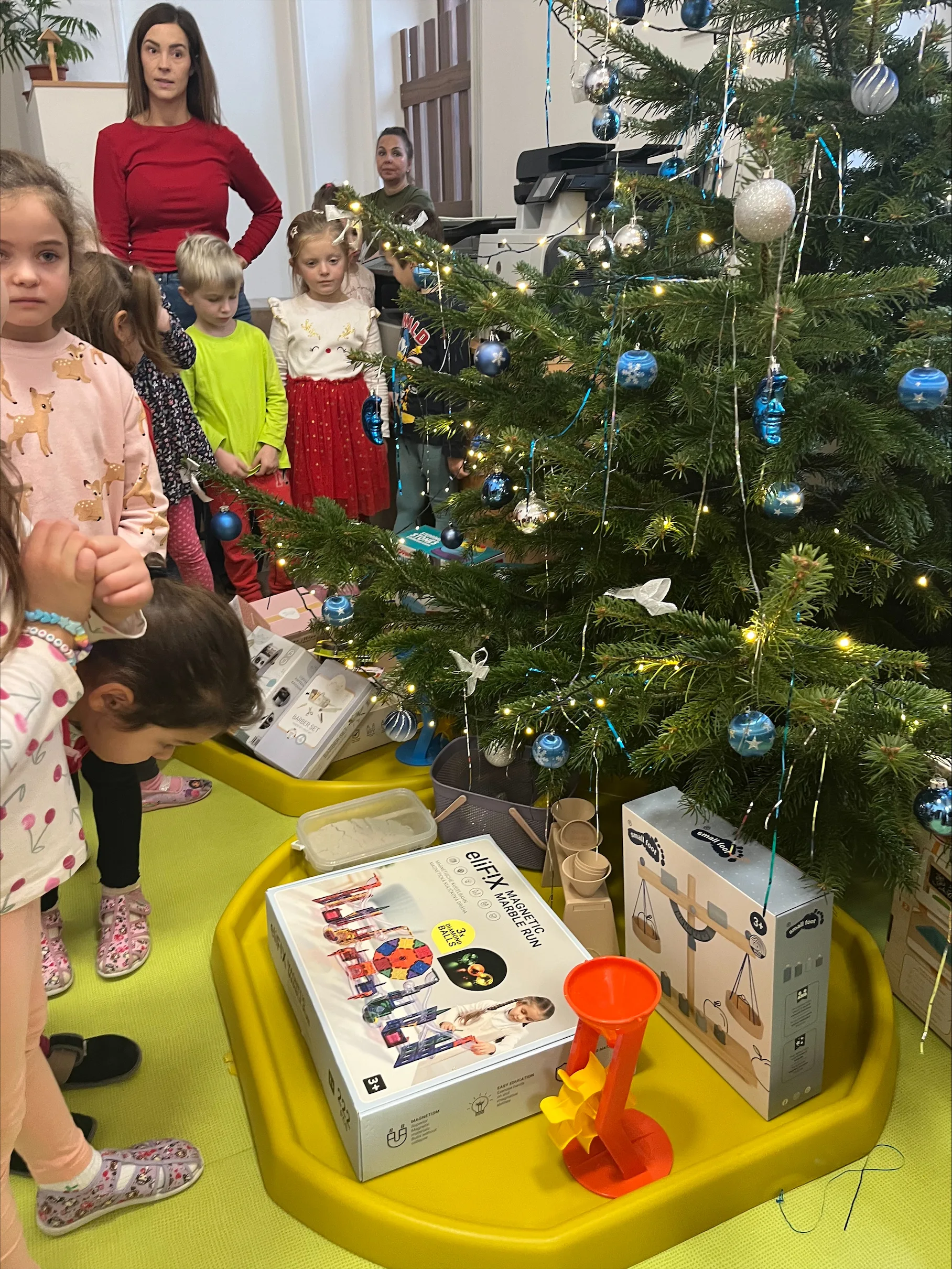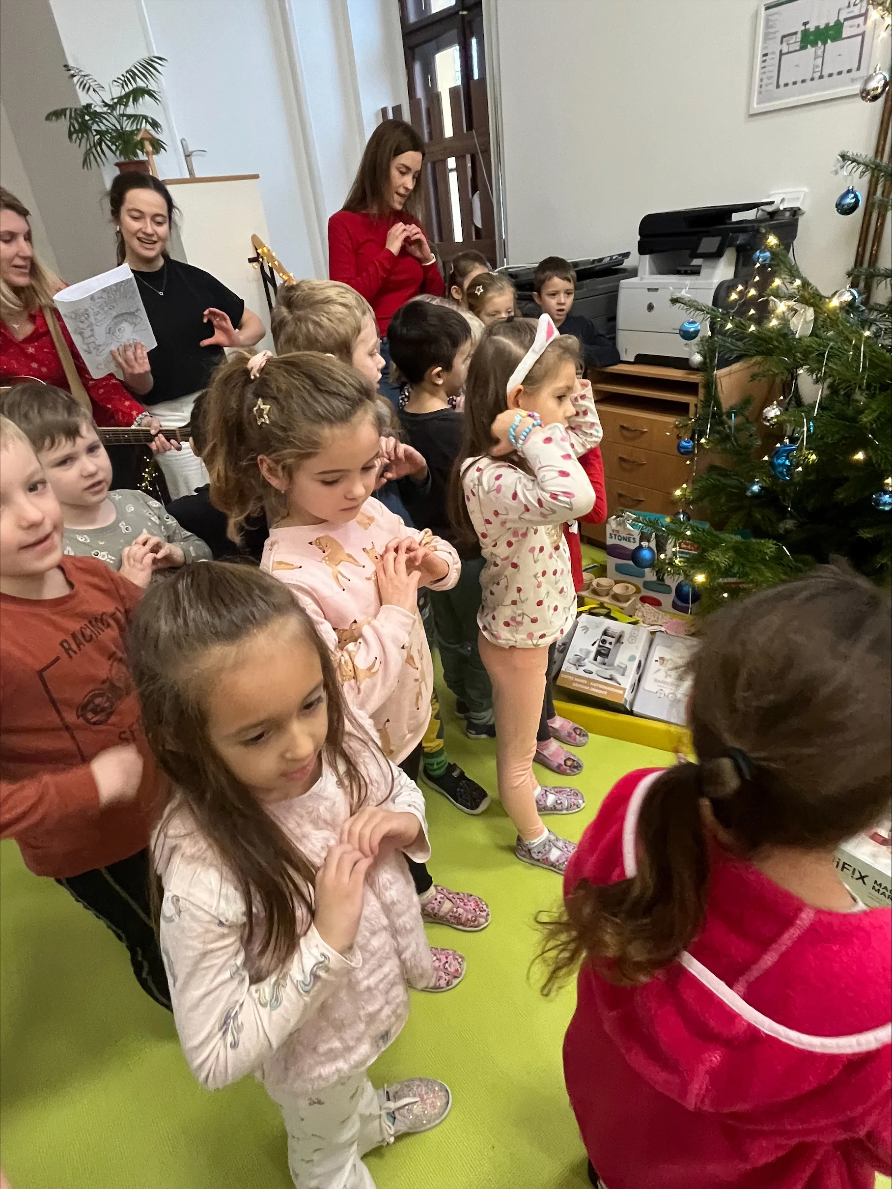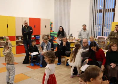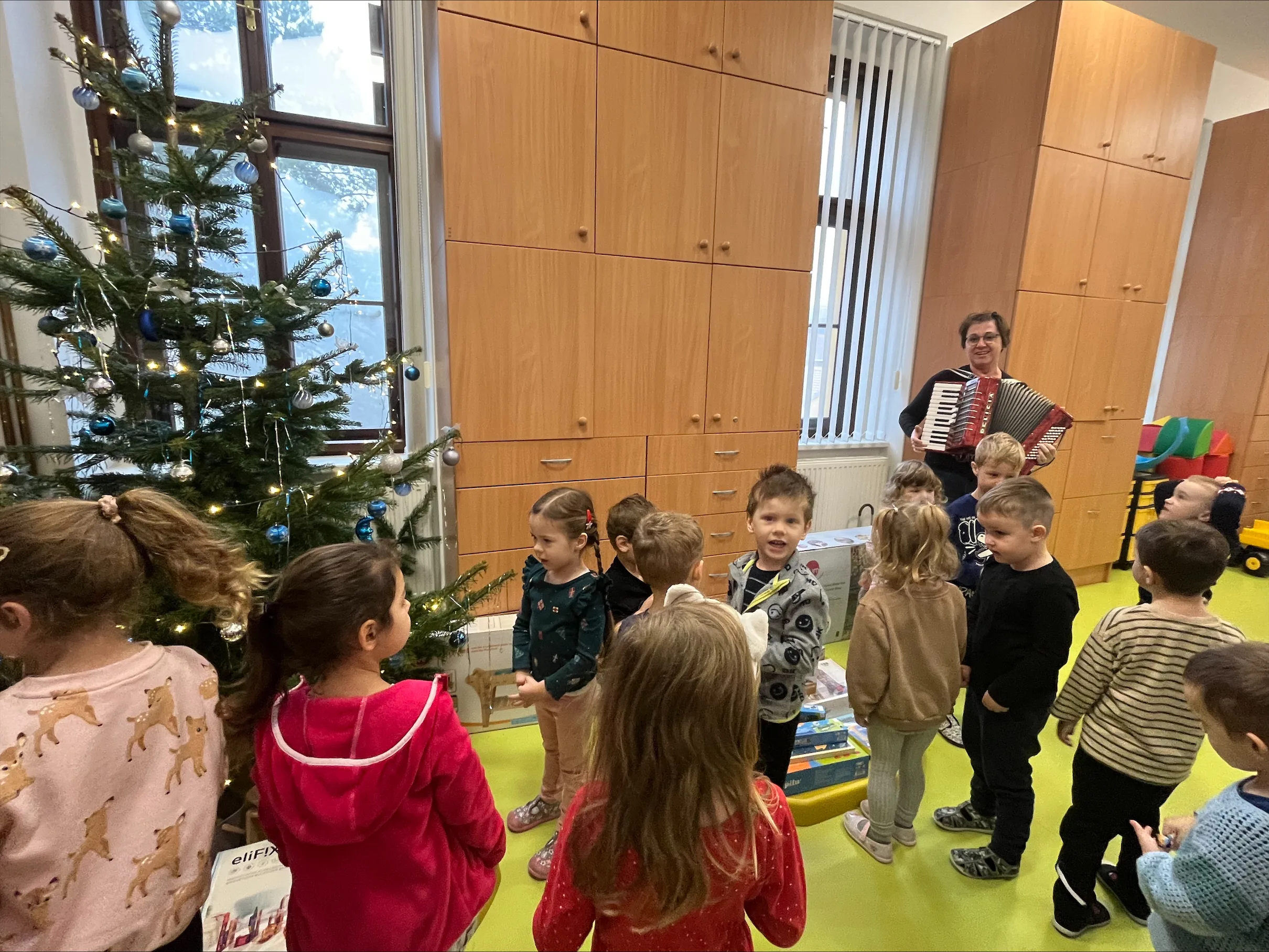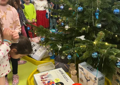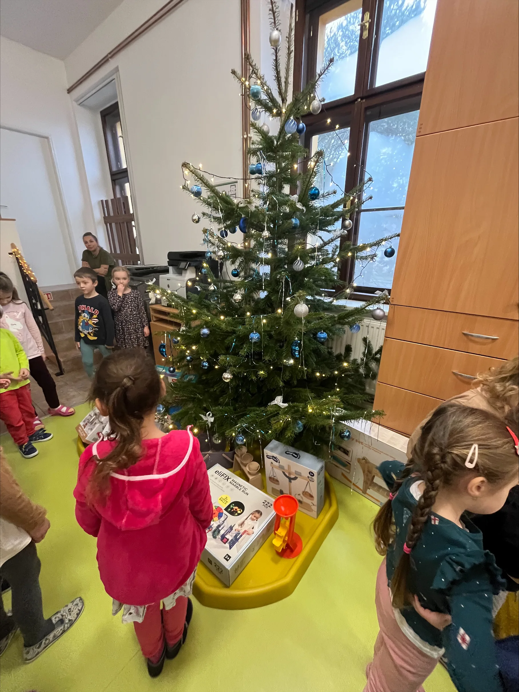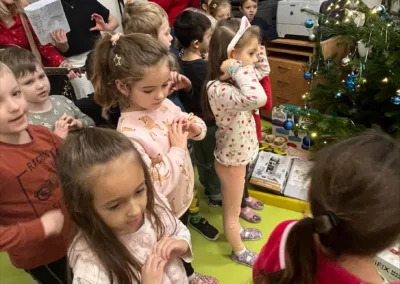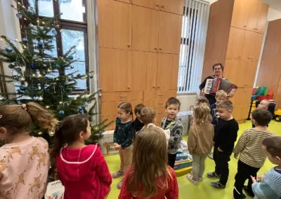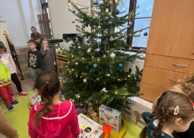 Společné zpívání jsme si užili u vánočního stromečku. Každá třída přispěla koledou, kterou se naučila. Poté následovala nadílka dárků do tříd a hry s nimi.