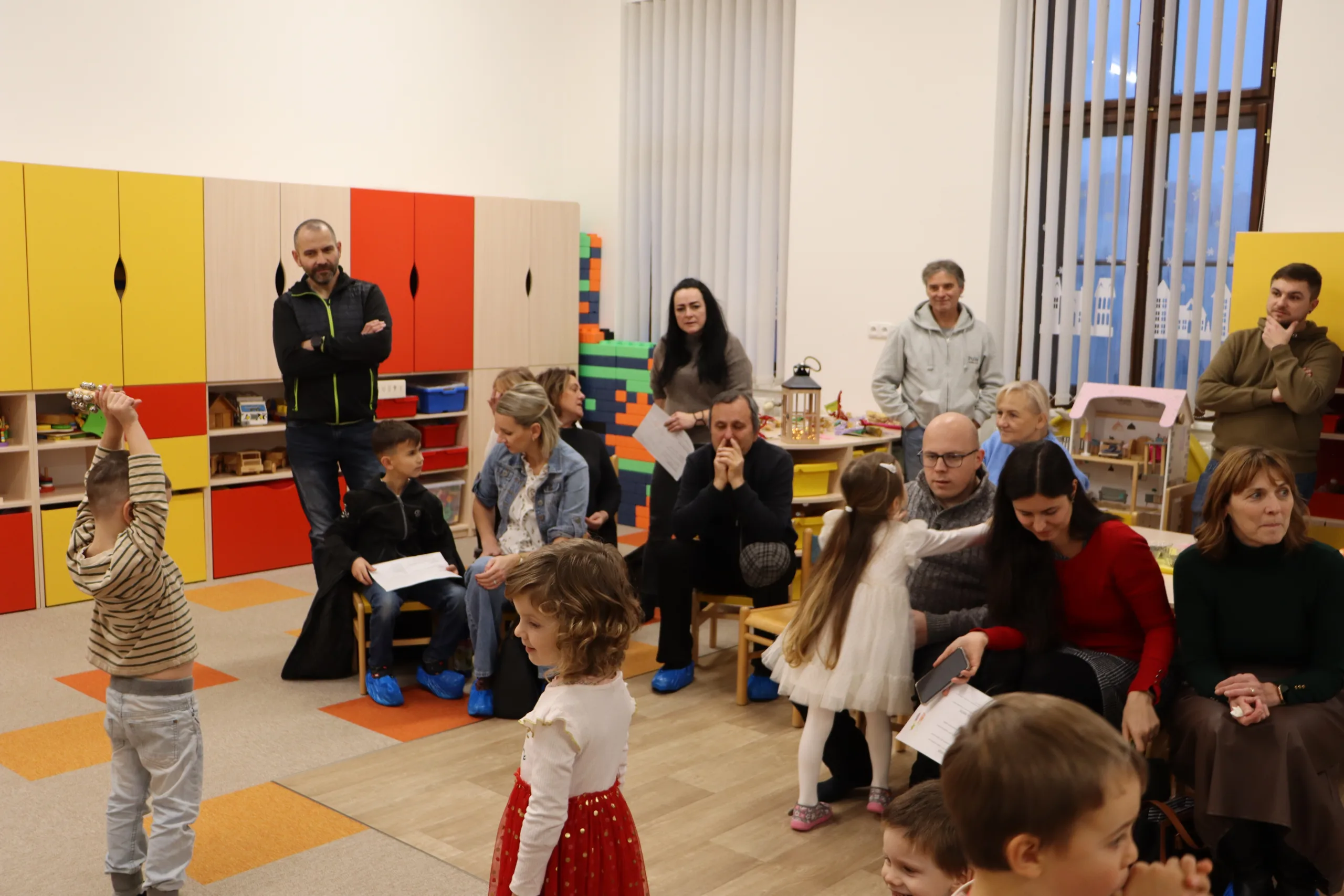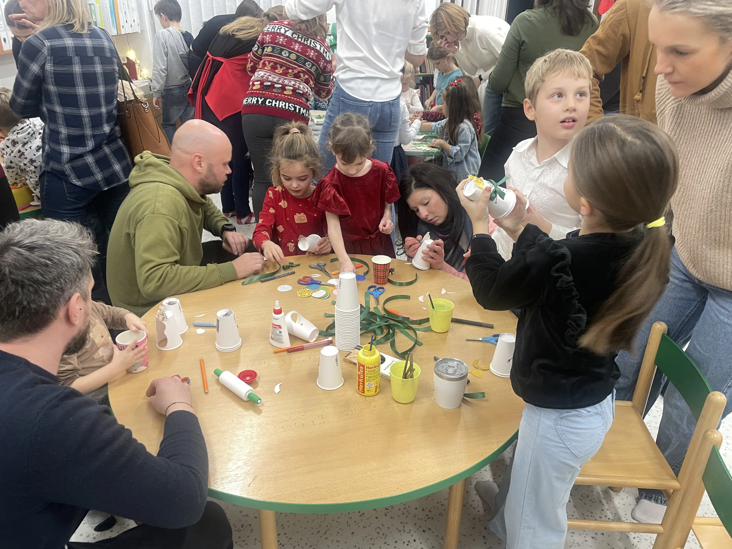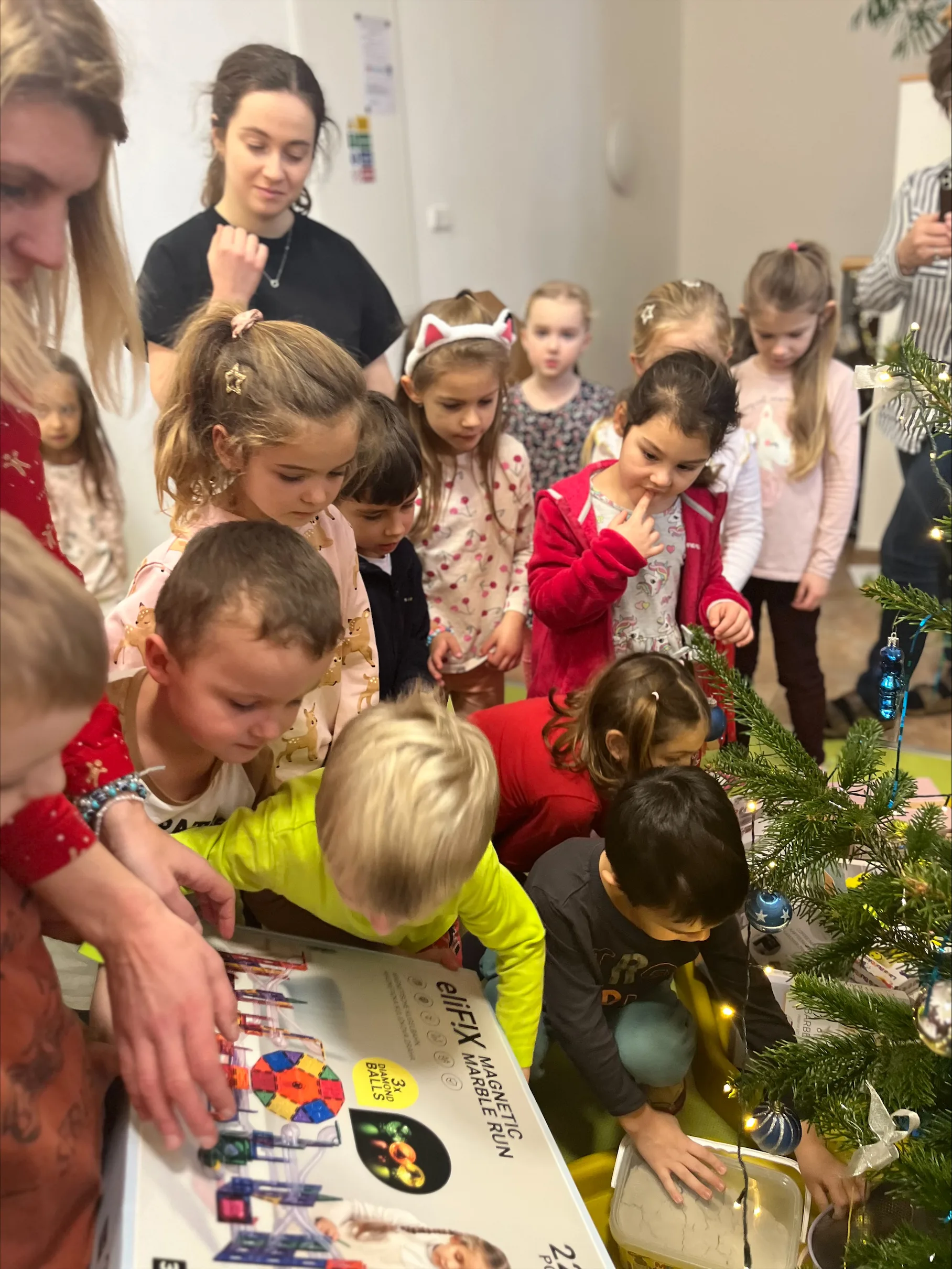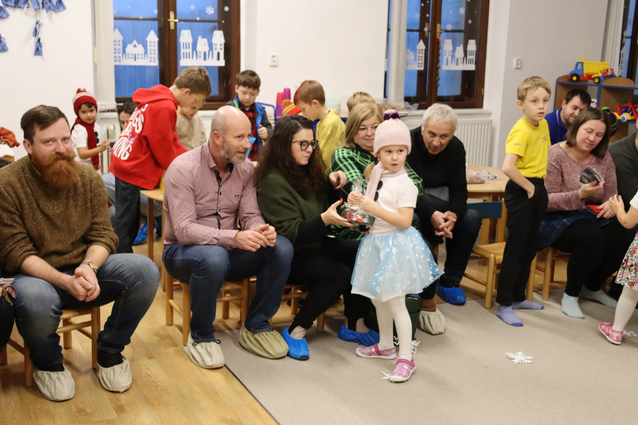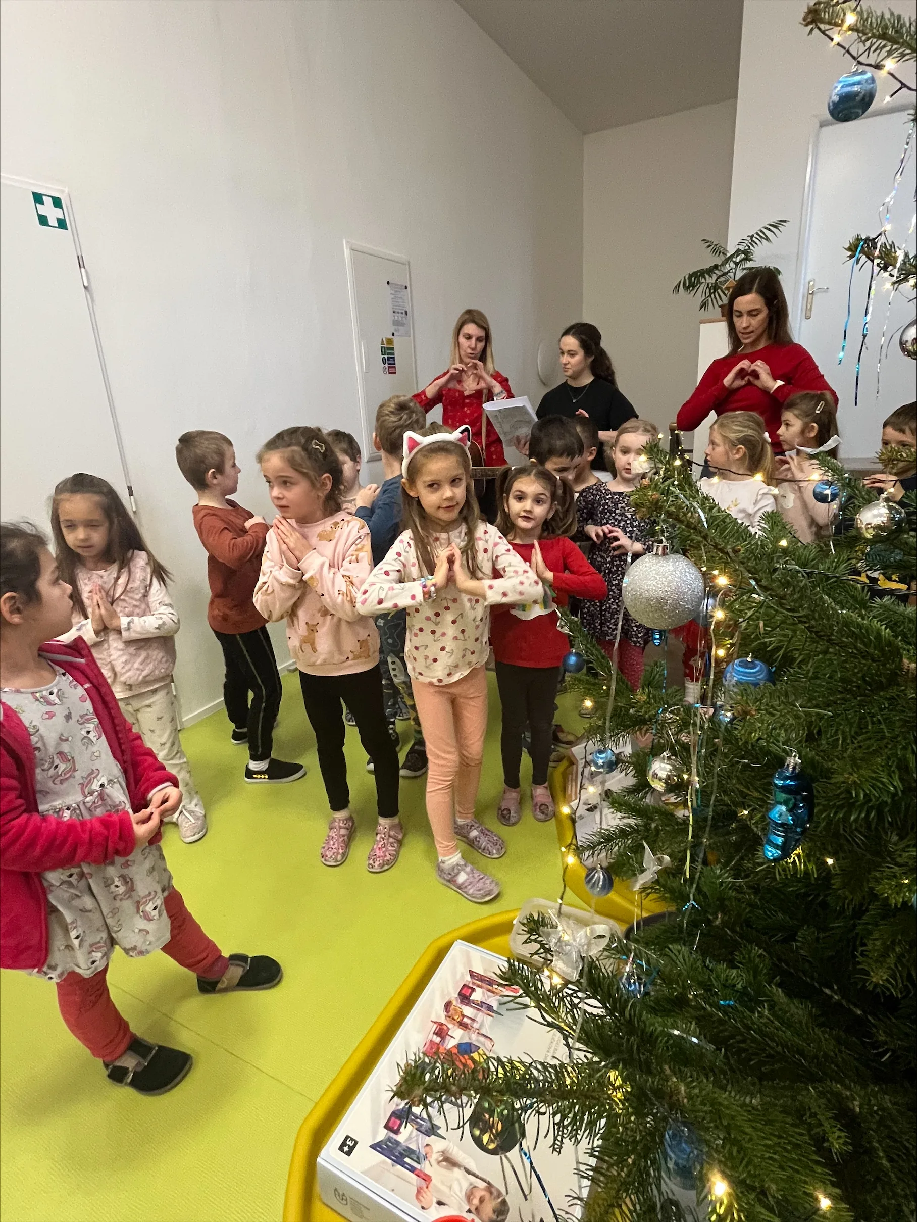 Společné zpívání jsme si užili u vánočního stromečku. Každá třída přispěla koledou, kterou se naučila. Poté následovala nadílka dárků do tříd a hry s nimi.