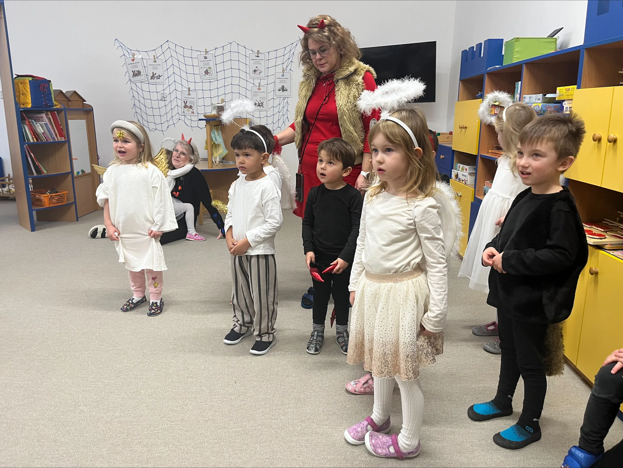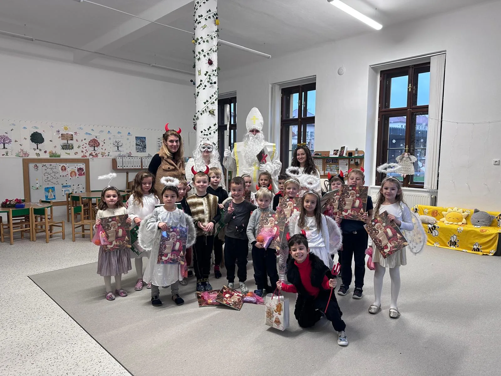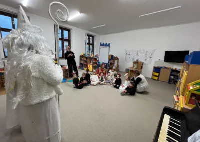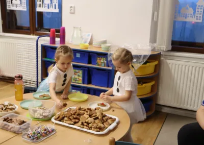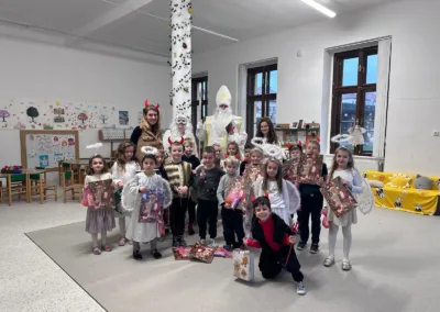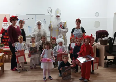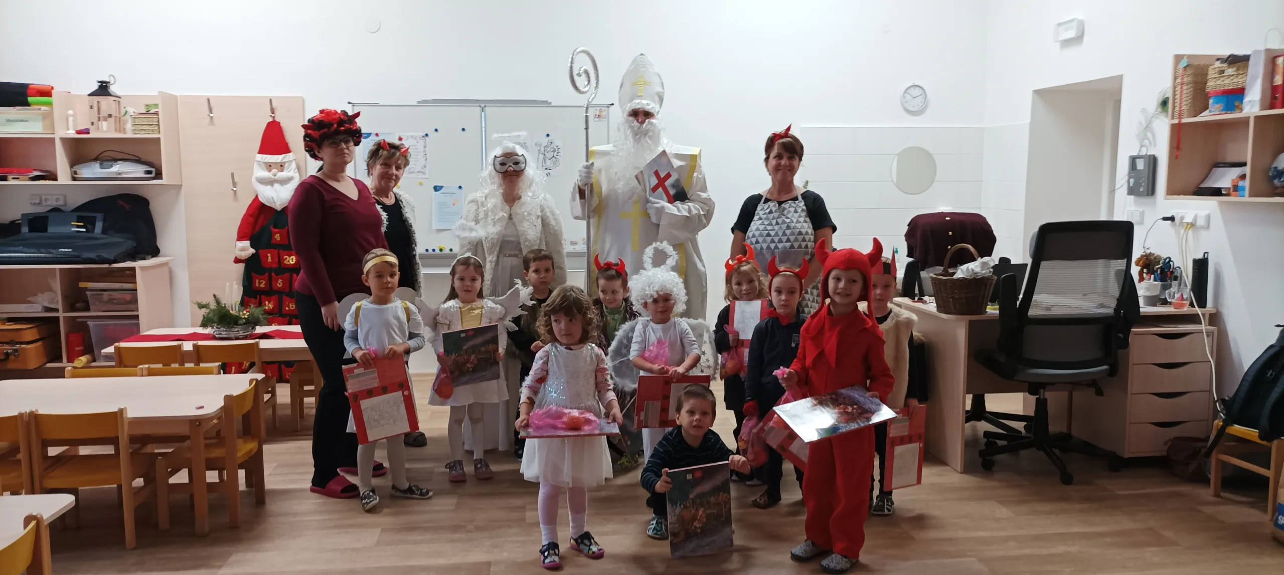 Adventní čas se nesl v duchu příprav. Školkou se nesla vůně perníčků a cukroví. Nejprve jsme si užili Den andílků a čertíků. Všechny děti i dospělí se převlékli do kostýmů, rejdili a plnili čarovné úkoly. Po svačince nás poctil svou návštěvou Mikuláš s andělem. Všechny děti dostaly malý dáreček.